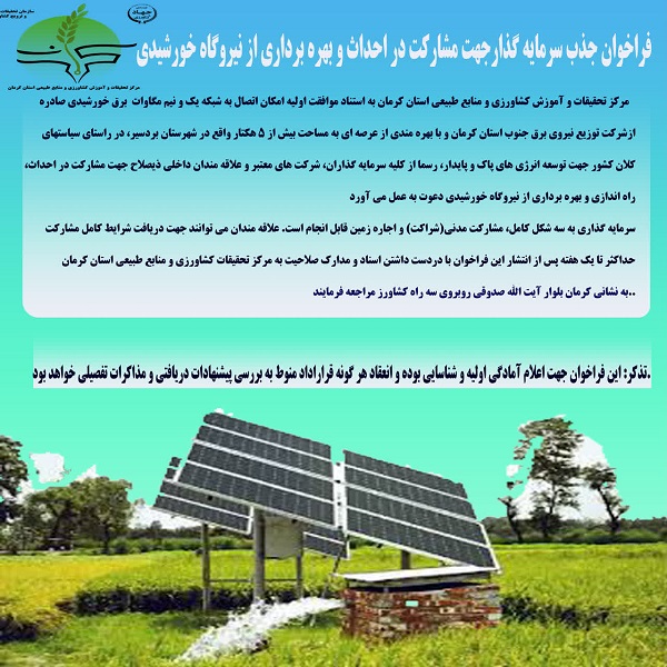 مرکز تحقیقات و آموزش کشاورزی و منابع طبیعی استان کرمان از کلیه سرمایه‌گذاران، شرکت‌های معتبر و علاقه‌مندان داخلی ذیصلاح جهت مشارکت در احداث، راه‌اندازی و بهره‌برداری از نیروگاه خورشیدی دعوت به عمل می‌آورد.