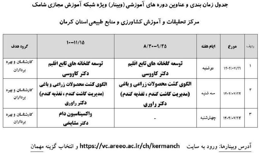 گزارش روابطعمومی مرکز تحقیقات و آموزش کشاورزی و منابع طبیعی استان کرمان؛ وبینارهای آموزشی هفته آتی از تاریخ دوشنبه ۲۱ مهر لغایت چهارشنبه ۲۳ مهرماه ۱۴۰۴ توسط مرکز تحقیقات و آموزش کشاورزی و منابع طبیعی استان کرمان برگزار خواهد شد.