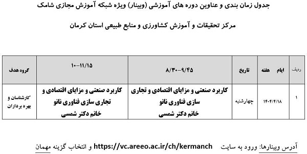 به گزارش روابط‌عمومی مرکز تحقیقات و آموزش کشاورزی و منابع طبیعی استان کرمان؛ وبینار آموزشی هفته جاری در تاریخ چهارشنبه 18 تیر توسط مرکز تحقیقات و آموزش کشاورزی و منابع طبیعی استان کرمان برگزار خواهد شد.
