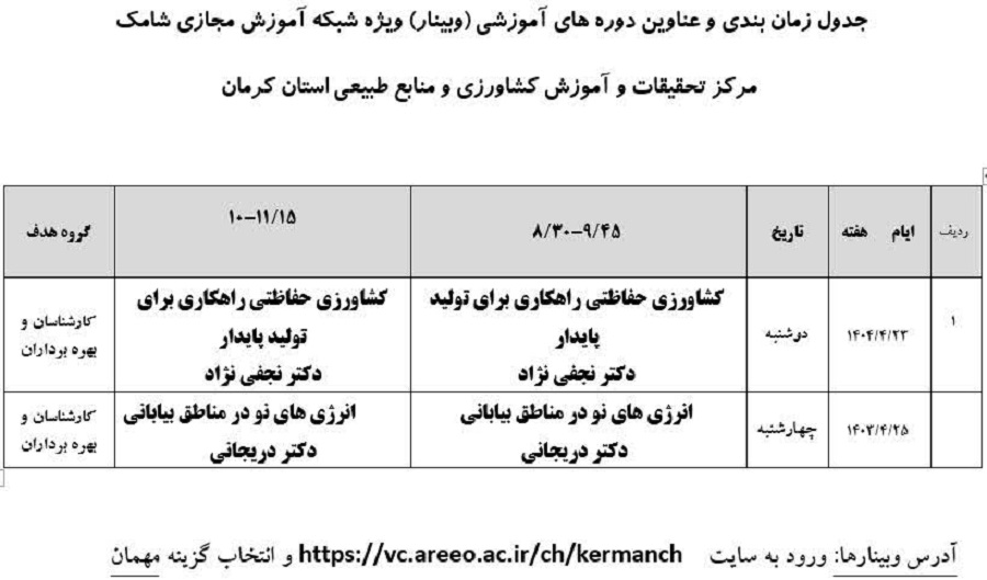 به گزارش روابط‌عمومی مرکز تحقیقات و آموزش کشاورزی و منابع طبیعی استان کرمان؛ وبینارهای آموزشی هفته جاری از تاریخ دوشنبه 23 تیرلغایت چهارشنبه 25 تیرماه ۱۴۰۴ توسط مرکز تحقیقات و آموزش کشاورزی و منابع طبیعی استان کرمان برگزار خواهد شد.